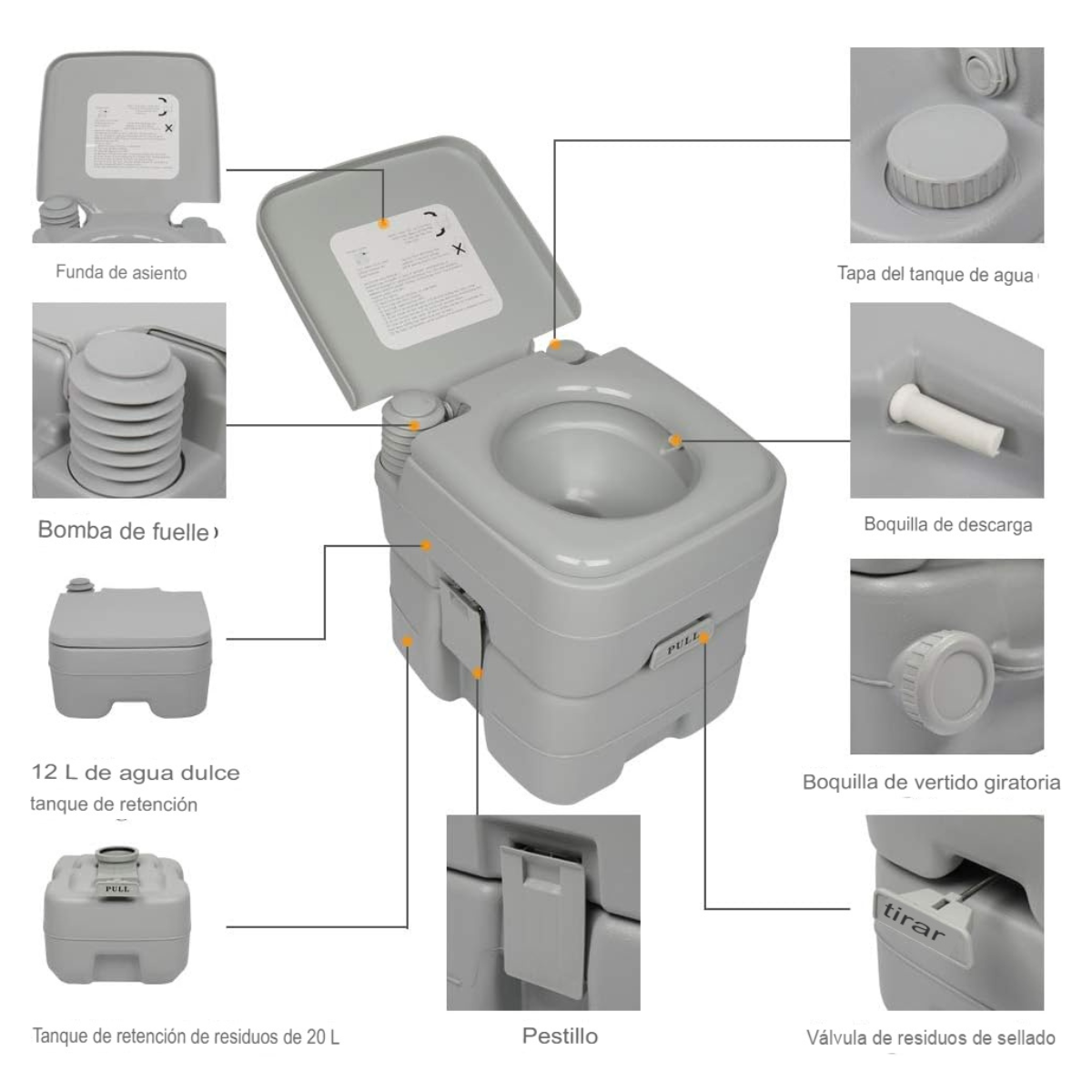 - Tanque de Gran Capacidad: Con un tanque de inodoro de 20 L, nuestro inodoro portátil supera a la mayoría de sus competidores, reduciendo la frecuencia de vaciado. Ideal para actividades al aire libre, camping, caravanas, viajes, barcos y más, siendo conveniente para todas las edades.